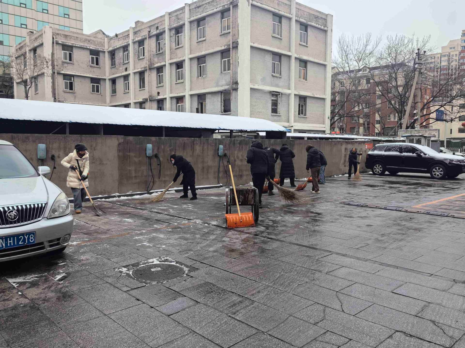 ??18日上午8時始,物業(yè)公司組織雙休日值班和輪班人員投入掃雪工作,用時2個多小時將表面積雪清理,但部分積雪已經(jīng)壓實冰凍,除雪難度大,亟需加大人員投入。得知這一情況后,為防止低溫導致路面結冰,影響周一駐廈人員出入安全,大廈黨支部向全體黨員發(fā)出支援除雪清雪倡議,號召黨員發(fā)揮先鋒作用,積極踴躍參與義務掃雪。下午2時30分,黨員同志放棄休息時間,準時在大廈集合,開始第二輪掃雪除雪工作。大家齊心協(xié)力,相互配合,鏟的鏟、敲的敲、推的推、掃的掃,為創(chuàng)造安全、整潔的樓院環(huán)境貢獻自身力量。經(jīng)過一個多小時的努力,大廈后院和車輛出入口處凍雪全部清理完畢,為駐廈人員和車輛的安全出入掃除了障礙。